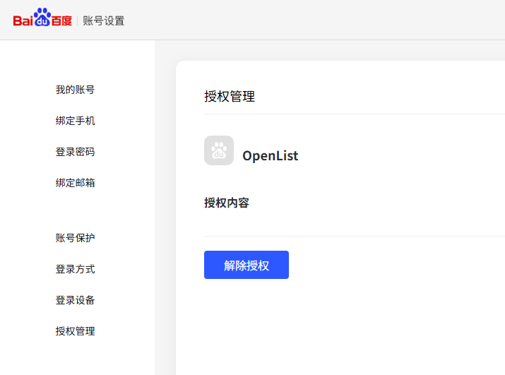 由于无法对各平台一一截取详细流程,欢迎各位热心网友前往 https://github.com/OpenListTeam/OpenList-Docs 提供解除授权的流程截图。